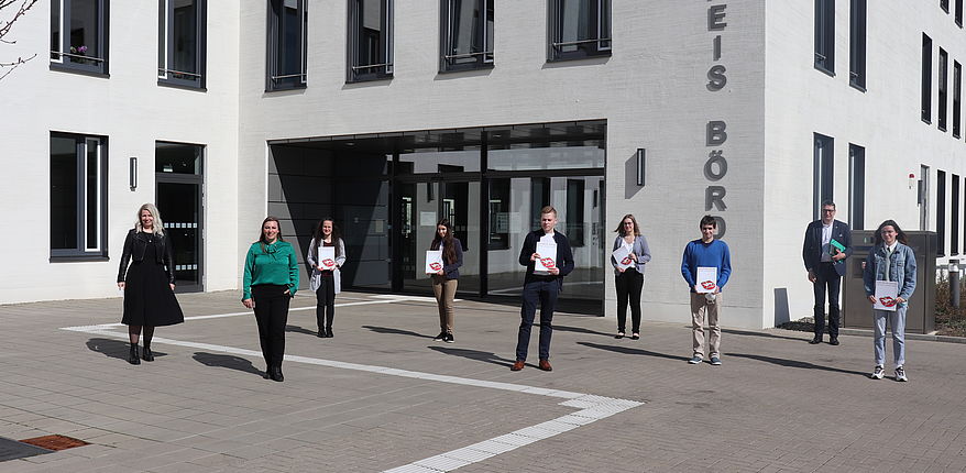 Aufstellung zum Erinnerungsfoto (v. l. n. r.): Personalamtsleiterin Julia Herzberg-Ebeling, Ausbildungsleiterin Manuela Brasch, Manja Lübke / Haldensleben, Pia Sophie Habedank / Barleben, Leon Hempel / Kroppenstedt, Linda Peters / Klüden Jakob Diebel / Hörsingen, Dezernent Dirk Michelmann, Lucy Begenau / Rogätz, nicht im Bild Vanessa Hanke / Groß Santersleben, eine Stelle wird noch besetzt (Foto Landkreis Börde).