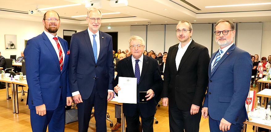 Es gratulieren (v.l.n.r.): Landrat Martin Stichnoth, Heinz-Lothar Theel, Kreistagsvorsitzender Thomas Schmette und Andreas Joachim Kühn, 2. stellvertretender Vorsitzender des Kreistages / Bildmitte Dr. Ernst Isensee.