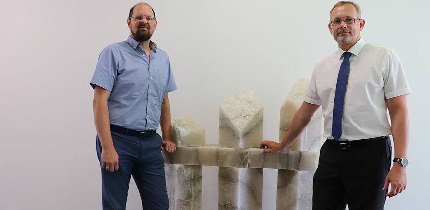 Werkleiter Dr. Holger Hoppe überlässt dem Landkreis Börde als Dauerleihgabe ein Ausstellungsstück aus Salz.
