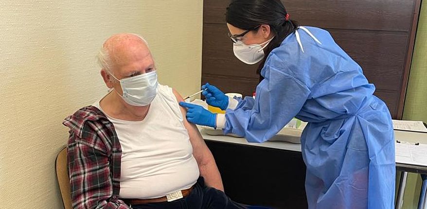 Und nicht nur das. Die ehrenamtlichen Helfer sind unentbehrlich. Jasmin Westphal für das DRK, hier im Kurhaus Flechtingen im Einsatz. Sie impft Ernst-Dieter Wiedemann.
