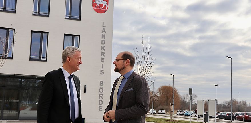 Landrat Martin Stichnoth und Thomas Pleye vor dem Verwaltungsgebäude des Landkreises Börde in Haldensleben. Die Behördenleiter tauschten sich zu Fragen der Zusammenarbeit aus. Als obere Kommunalaufsicht zum Beispiel wacht das Landesverwaltungsamt darüber, dass sich die Verwaltung des Landkreises im Rahmen der Gesetze bewegt.