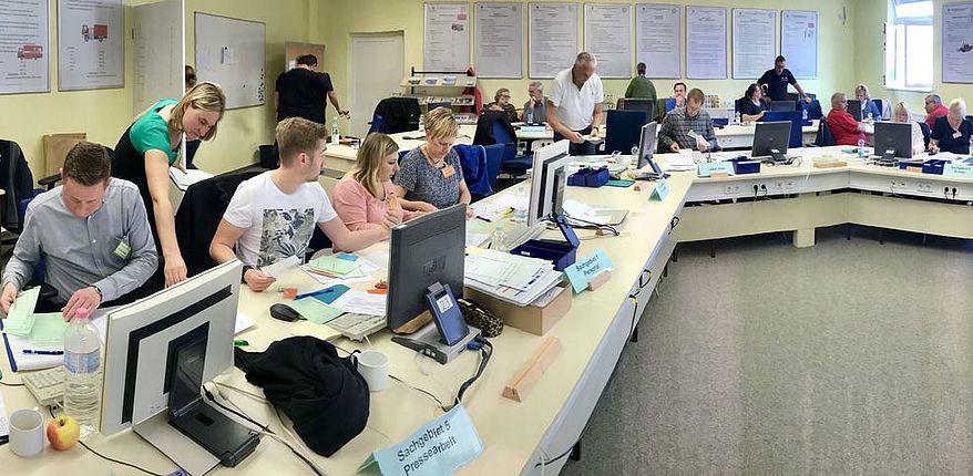 Bildunterschrift 1: Der Katastrophenschutzstab des Landkreises Börde trainierte in Heyrothsberge Handlungsabläufe in einer Krisensituation. (Foto Uwe Baumgart)