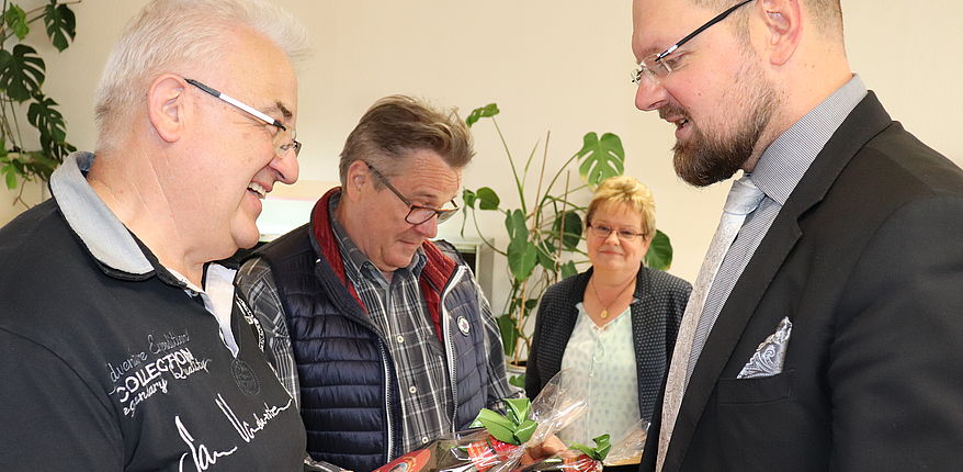 Landrat Martin Stichnoth beim Eigenbetrieb Straßenbau und -unterhaltung des Landkreises Börde. Klaus-Dieter Glemnitz (links vorne) und Gundolf Krüger (dahinter) werden in den Ruhestand verabschiedet. Karin Neuendorf, Leiterin des Eigenbetriebes (Bildmitte) verfolgt das Geschehen.