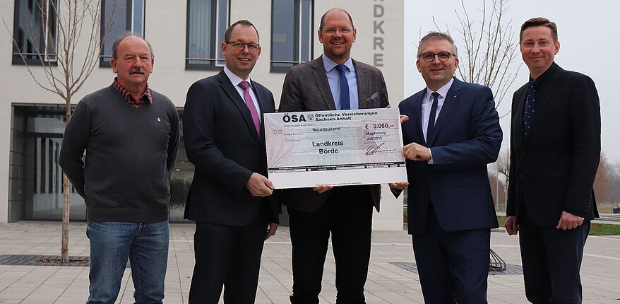 Der Landkreis Börde hat heute von den Öffentlichen Versicherungen Sachsen-Anhalt (ÖSA) eine kräftige Geldspritze erhalten. Landrat Martin Stichnoth nahm einen Scheck über 9.000 Euro entgegen, den ihm der Haldensleber ÖSA-Geschäftsstellenleiter Thomas Lippold und ÖSA-Bezirksdirektor Frank Meyer überreichten.