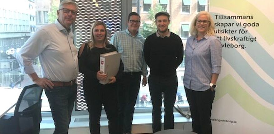 Bildunterschrift: In Stockholm wurden die Eckpunkte der Zusammenarbeit fixiert. V. l. n. r.: Peter Waglund (Bollnäs), Ausbildungsleiterin Manuela Brasch, Danny Schonscheck, Fachdienstleiter Wirtschaft, Bildungskoordinator Christoph Heimel (alle Landkreis Börde), daneben Emma Golläs (Bollnäs) / Foto Landkreis Börde.