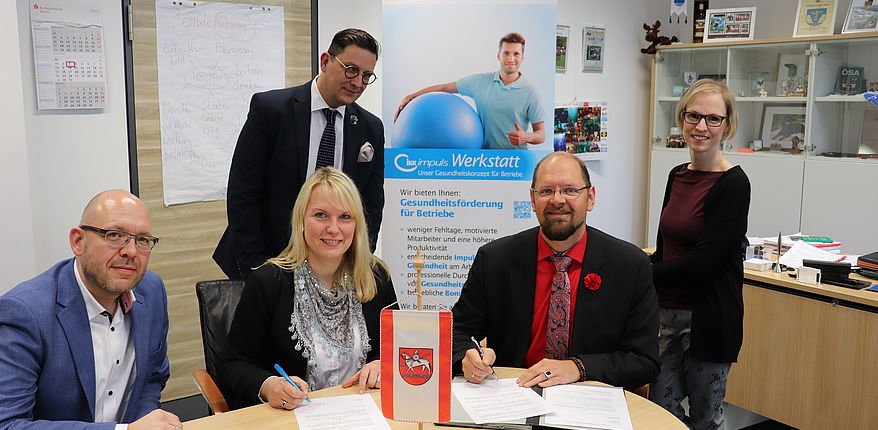 Landrat Martin Stichnoth und Stefanie Schäfer, Fachbereichsleiterin Betriebliche Gesundheitsförderung / IKK gesund plus, unterschreiben die Vereinbarung. Weiter im Bild (v. r . n. l.) Mareike Bergmann, Gesundheitsmanagement und Arbeitsschutz beim Landkreis, Dezernent Dr. Marcus Waselewski und Danny Meyer / IKK gesund plus.