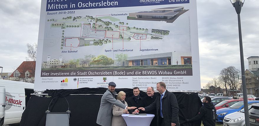 (Oschersleben / 05.03.2020) Großer „Bahnhof“ auf dem „Bahnhof“. Aus dem Städtebauprogramm gefördert bekommt das „Bahnhofsareal“ in Oschersleben ein neues „Gesicht“. Verkehrsminister Thomas Webel hat symbolisch den roten Knopf für den Baustart gedrückt. Unterstützung hatte Webel von Landtagspräsidentin Gabriele Brakebusch, von Börde-Landrat Martin Stichnoth sowie von den Bauherren Bürgermeister Benjamin Kanngießer und BEWOS-Geschäftsführer Thomas Harborth. Als kommunales Unternehmen ist die BEWOS maßgeblich an der Entwicklung der Stadt an der Bode beteiligt.