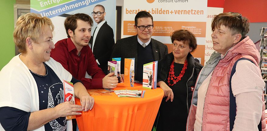 Das Interesse an der Gründermesse war groß. Vizelandrätin Iris Herzig (links) ist hier mit Heike Jaworski, eine Existenzgründerin aus Bülstringen (rechts), im Gespräch. Daneben Astrid Claus und Danny Schonscheck vom Fachdienst Wirtschaft des Landkreises Börde, und Kai Kraudi, Bildungsreferent des Koordinierung- & Beratungszentrums „EMI“