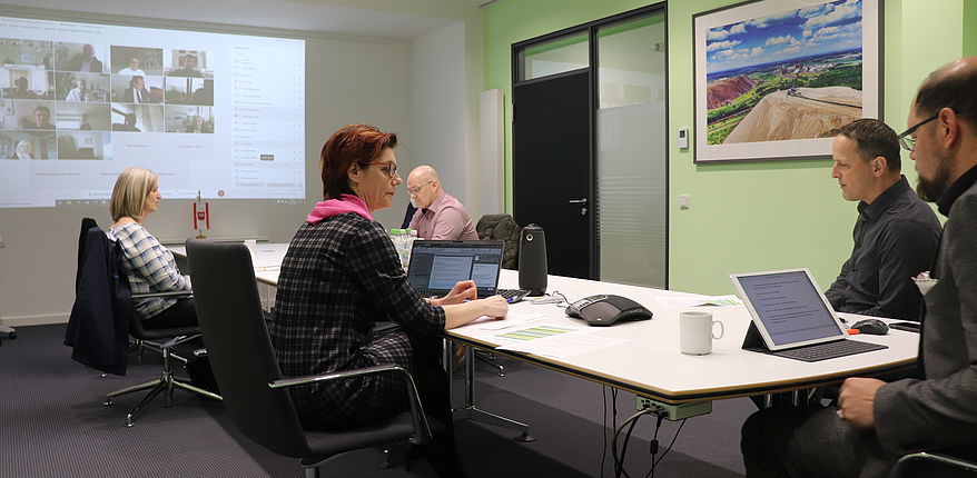 Zur Abstimmung von Fragen der Pandemiebekämpfung gibt es vom Landkreis Börde wöchentliche Videokonferenzen des Landrates mit den Bürgermeistern der Einheits- und Verbandsgemeinden. In dieser Woche ging es zum Beispiel um Fragen der Impfstrategie. Deshalb waren, auf Abstand, aus dem Impfzentrum des Landkreises Börde Katrin Baier (ärztliche Leiterin), Jens Sips (organisatorischer Leiter), Stefan Crackau (Terminabläufe) und Janina Kluge (Leiterin Büro Landrat) als Konferenzteilnehmer dabei. Der Raum mit dem Namen „Kalimandscharo“ (die touristisch erschlossene „Kalihalde“ ist auf dem Foto an der Wand dargestellt) dient Martin Stichnoth als „Konferenzzentrale“.