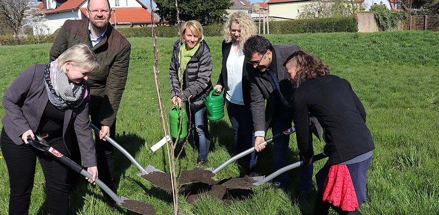 Landrat Martin Stichtnoth (2.v.l.) und LAMSA Geschäftsführer Mamad Mohamad (2.v.r) planzen einen Apfelbaum.