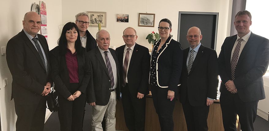 V. l. n. r.: Detlev Lehmann / Geschäftsführer Kommunaler Arbeitgeberverband (KAV) Sachsen-Anhalt), Kerstin Fantasny-Friedrich / Geschäftsstelle KAV, Holger Platz / Beigeordneter Landeshauptstadt Magdeburg, Jürgen Dannenberg / Landrat Landkreis Wittenberg, Landrat Hans Walker / Vorsitzender des KAV, Monika Ludwig / Bürgermeisterin Verbandsgemeinde An der Finne, Heiko Liebenehm / Beigeordneter Städte- und Gemeindebund Sachsen-Anhalt, Thomas Barz / Bürgermeister Stadt Genthin (Foto Uwe Baumgart / Landkreis Börde)