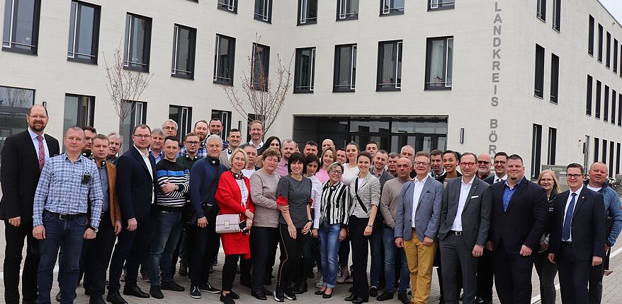 Die Delegation nahm vor dem Verwaltungsgebäude des Landkreises Börde Aufstellung zum Erinnerungsfoto. Landrat Martin Stichnoth (ganz links im Bild) sagte zur Begrüßung „Wenn wir die Gelegenheit haben wirtschaftliche Netzwerke zu entwickeln, dann sind wir dabei“