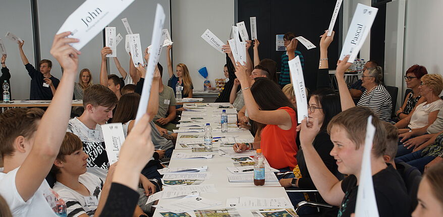 Drei Klassen schlüpften in die Rolle von Kreistagsmitgliedern, stellten Fraktionssitzungen und Ausschusssitzungen sowie eine große Kreistagssitzung nach. Sie schrieben Anträge zu Themen, die ihnen wichtig sind. Unter anderem zu mehr Möglichkeiten für Freizeitaktivitäten, zur landkreisweiten Aufstellung von kostenlosen Wasserspendern oder zur Einrichtung einer Abgabestelle für Kondome, die anonym genutzt werden kann. Sie diskutierten diese Themen in ihren Fraktionen sowie Ausschüssen und stimmten am Ende über die Anträge ab.