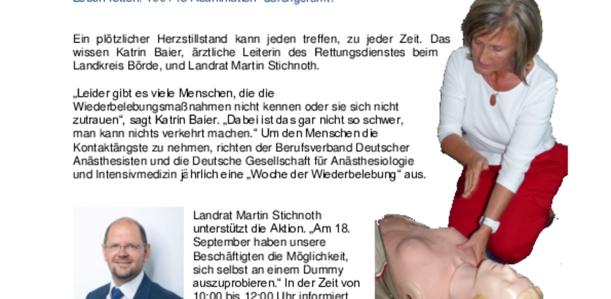 Ein plötzlicher Herzstillstand kann jeden treffen, zu jeder Zeit. Das wissen Katrin Baier, ärztliche Leiterin des Rettungsdienstes beim Landkreis Börde, und Landrat Martin Stichnoth. „Leider gibt es viele Menschen, die die Wiederbelebungsmaßnahmen nicht kennen oder sie sich nicht zutrauen“, sagt Katrin Baier. „Dabei ist das gar nicht so schwer, man kann nichts verkehrt machen.“ Um den Menschen die Kontaktängste zu nehmen, richten der Berufsverband Deutscher Anästhesisten und die Deutsche Gesellschaft für Anästhesiologie und Intensivmedizin jährlich eine „Woche der Wiederbelebung“ aus.