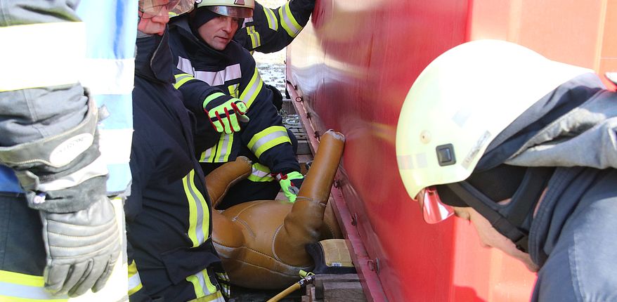 Bildunterschrift: Eine eingeklemmte Person musste mit den eigenen Einsatzmitteln unter Beteiligung des Rettungsdienstes befreit werden