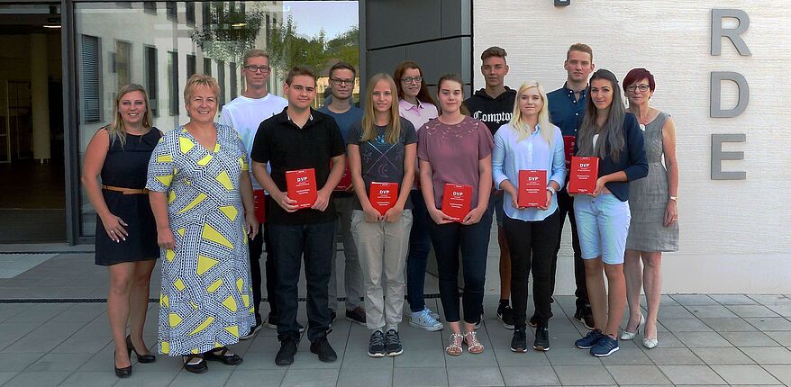 Auf dem Bild zu sehen v. l. n. r.: Ausbildungsleiterin Manuela Brasch, Fachbereichsleiterin Iris Herzig, Jannik Gläsmann, Tim Horstmann, Tobias Schenke, Laura Frank, Jennifer Genz, Lea Helmich, Jan Röpke, Emely Michaela Wall, Jan Guhl, Celine Stich und Sylvia Schulze, Leiterin des Fachdienstes Personal (Foto Landkreis Börde)