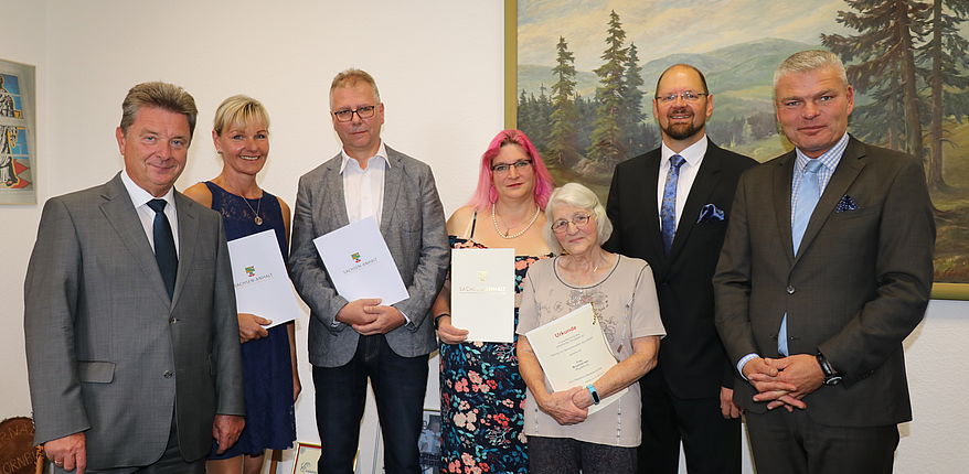 Auf dem Bild zu sehen (v.l.n.r):Magdeburgs Oberbürgermeister Dr. Lutz Trümper, Bettina Kummer, Hans-Martin Irmscher, Lisa Marie und Brunhild Iser, Landrat Martin Stichnoth sowie Innenminister Holger Stahlknecht.