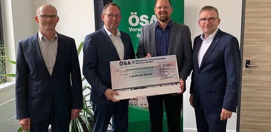 Groß war die Freude, als ÖSA-Bezirksdirektor Frank Meyer und seine Kollegen Andreas Zimmer und Thomas Lippold dem Landkreis in diesen Tagen einen Scheck in Höhe von 9.220 Euro überreichten. Der Landkreis Börde hatte die Schadenquote an seinen bei der ÖSA versicherten Gebäuden im vergangenen Jahr verhältnismäßig gering halten können, deshalb „kommen wir nun in den Genuss dieser Rücklaufmittel“, sagt Martin Stichnoth. „Nicht zuletzt durch ihren Satzungszweck und die öffentliche Beteiligung ist die ÖSA ein wichtiger und zuverlässiger Partner der kommunalen Familie“, unterstreicht der Landrat.