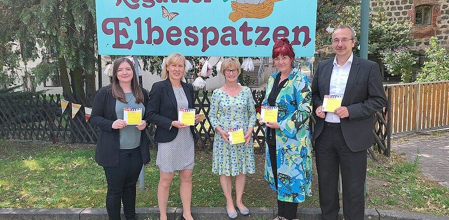 Die offizielle Übergabe der Broschüre fand am 06.07. in der Verbandsgemeinde Elbe-Heide in Rogätz statt. Anwesend waren Herr Schmette, Verbandsgemeindebürgermeister, Frau Schröder, Grundschulleiterin in Rogätz, Frau Mark-Richmann, Kita-Leiterin in Rogätz sowie vom Landkreis Börde Frau Hecht, komm. Dezernentin 2 und Frau Pennekamp, Projektmitarbeiterin Bildungskommune. Die Broschüre wird nun an die Gemeinden des Landkreises Börde ausgegeben und von dort aus an die Kitas und Grundschulen verteilt. Sie dient als umfassender Handlungsleitfaden für einen gelungenen Übergang der Kinder aus der Kita in die Schule.