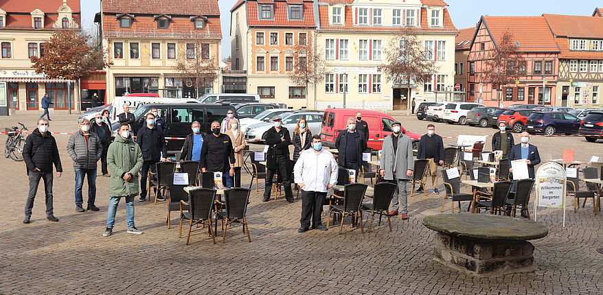 Konditormeister Lutz Pfeiffer, seine Berufskollegen und Haldensleber Gastronomen haben Tische und Stühle aufgebaut. Stichnoth weiß im Vorfeld der Bund-Länder Verhandlungen heute und der Öffnungsplanung der Landesregierung worum es den Akteuren geht. „Sie machen berechtigterweise auf ihre Lage aufmerksam."