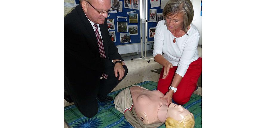 Notarzt- und Feuerwehrfahrzeug mit fachkundiger Erläuterung sowie medizinische Informationen zum richtigen Verhalten beim Herzinfarkt