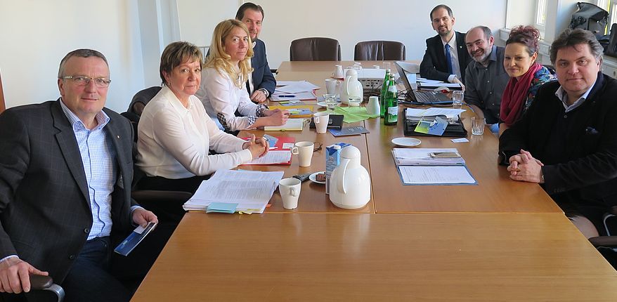 Links von vorn: Bürgermeister Ingersleben Thomas Crackau, Marlinde Lehmann, Manja Wuttke und Justiziar Marten Schulz (alle Landkreis Börde) // Rechts von vorn: Uwe Schäfer, Sven Volkers und Romy Finger (alle Landkreis Wolfenbüttel / „Stiftung Zukunftsfonds Asse“) und Mathias Weiß / Verbandsgemeindebürgermeister Flechtingen (Foto Landkreis Wolfenbüttel)
