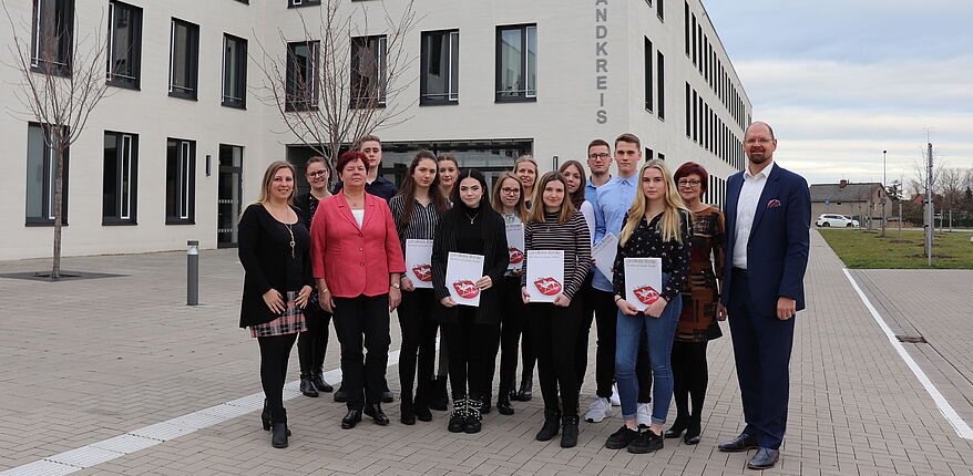 Der Landrat nutzt die Gelegenheit, um mit den künftigen Auszubildenden ins Gespräch zu kommen. „Wir setzen auf die Jugend“, sagt er. „Nicht nur in der Wirtschaft fehlt qualifiziertes Personal, auch öffentliche Verwaltungen haben Fachkräftebedarf. Unsere Personalentwickler haben zum Beispiel analysiert, dass bis 2025 rund 150 Mitarbeiter in den Ruhestand gehen. Hängen Sie sich also richtig rein“, betont Stichnoth. „Erreichen Sie nach 3 Ausbildungsjahren gute Ergebnisse, dann haben Sie auch die Chance, einen festen Anstellungsvertrag in einer Verwaltung zu bekommen, die für die Folgejahre alle Möglichkeiten der persönlichen und beruflichen Entwicklung bietet.“