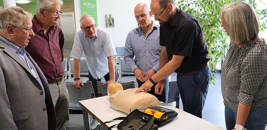 Im Foyer der Kreisverwaltung am Empfang hängt deutlich sichtbar ein gelber Kasten mit der Aufschrift Defibrillator. Landrat Martin Stichnoth sensibilisiert nicht nur im Rahmen der Herzwoche seine Beschäftigten dafür, sich mit den Abläufen der Herz-Lungen-Wiederbelebung zu beschäftigen. "Auch die Öffentlichkeit sollte wissen, dass wir solch ein Gerät hier zum Einsatz bereithalten. Im Notfall kann der Defibrillator helfen, Menschenleben zu retten."