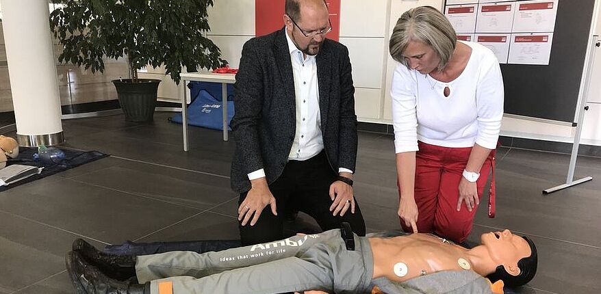 Katrin Baier, ärztliche Leiterin des Rettungsdienstes beim Landkreis Börde  und Landrat Martin Stichnoth beim Reanimationstraining