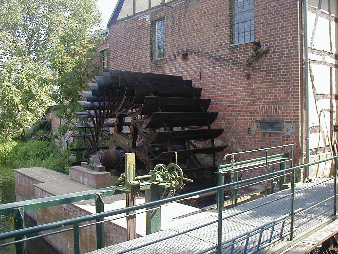 Wassermühlenstandort seit dem 16. Jh. belegt, heutige Bausubstanz 18./19. Jh., bis 1973 (zuletzt mit Elektromotor) in Betrieb. Langgestreckter zweigeschossiger Fachwerkbau mit hofseitig vorgeblendeter Gründerzeitfassade, giebelseitig angebrachtes Wasserrad. Nach Aufgabe des Betriebes wurde die komplette Einrichtung einschließlich der Wasserradwelle demontiert, seit den 1980er Jahren wird die Anlage durch den neuen Eigentümer schrittweise instand gesetzt. 1995 erneuertes, funktionstüchtiges Zuppinger- Wasserrad (5,45 m Durchmesser, Schaufelbreite 2,40 m). Die mühlentechnische Enrichtung ist in Resten erhalten: liegendes Hauptgetriebe, Schrotgang mit Steinkran in Resten, Schrotmaschine (Fabrikat: ILUS), Fahrstuhl. Zusammenarbeit mit der Fachhochschule Magdeburg zum Zwecke der Elektroenergierezeugung aus Wasserkraft. seit dem 11.09.2013 wurde in der Mühle ein Cafè eingerichtet, die "Kaffeemühle-Elbeu".
