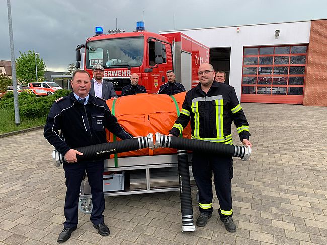 Der Behälter, verladen auf einem Anhänger, wird im Bedarfsfall vor Ort aufgebaut und mit wasserführenden Fahrzeugen befüllt. Für einsatztaktische…