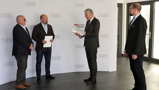 Innenminister Holger Stahlknecht hat 2 Belobigungsurkunden im Gepäck, als er gemeinsam mit Landrat Martin Stichnoth 2 Lebensretter belobigt. Durch das…
