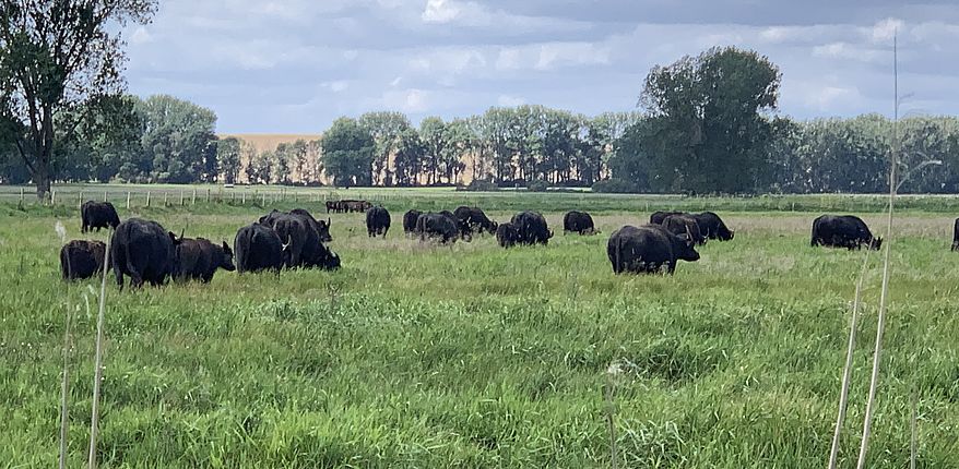 Ausschlaggebend für die ersten sichtbaren Erfolge der Umstellung der Flächennutzung und für die Ausrichtung der Bewirtschaftung auf eine Erhöhung der Biodiversität des Seelschen Bruchs war die Geschäftsführung der Agrargenossenschaft Emden. Die Geschäftsführerin Silke Fischer und Vorstandsmitglied Michael Daul sind mit ganzem Herzen dabei, wenn sie über ihre Tiere sprechen. Sie geben den Exkursionsteilnehmern Auskunft über die Wasserbüffel, Exmoorponys und Fleckvieh-Rinder, die auf einer zurzeit etwa 80 Hektar großen eingezäunten Teilfläche weiden.